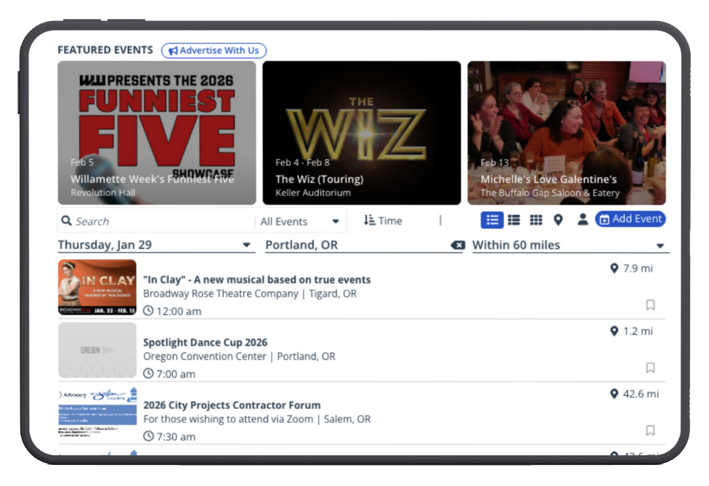Listing your event on getbusy.wweek.com is free. Start there by following these instructions to get your event on the calendar, and then leverage this package for increased viewability and targeted advertising.